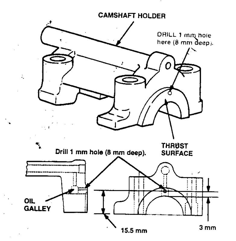 Honda has issued a Service Bulletin on the 1994 VF750C Magna regarding a knocking noise from the cylinder head areas. The noise varies as you tip the bike from side to side. It is likely caused by sideways thrust movement of the camshafts which then knock against their holders. The solution is to drill a small hole of precise diameter, length, and location, in each of the cam holders. This allows oil to seep into the space between the end of the camshaft and its holder to cushion the sideways thrust motion.