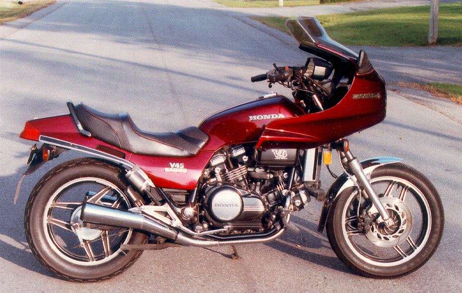 I owned a Honda V45 sabre (VF750S) from 1985 through 1996. Currently I own a 1993 Honda VFR750F and a 2001 Honda VFR800FI. My VFR pages include product reviews and a series of articles on cartridge fork service, among other things.