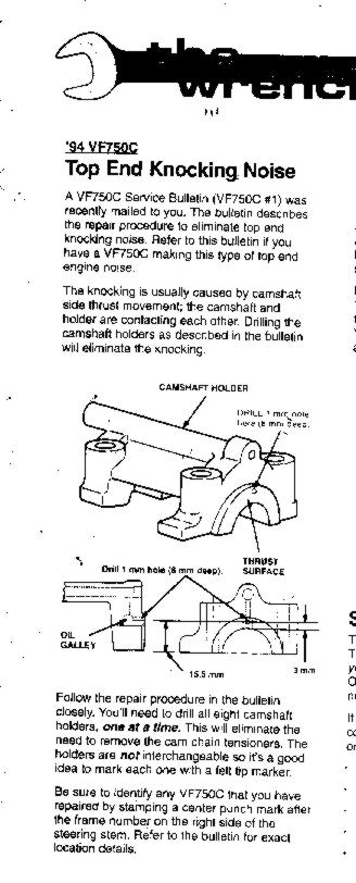Honda has issued a Service Bulletin on the 1994 VF750C Magna regarding a knocking noise from the cylinder head areas. The noise varies as you tip the bike from side to side. It is likely caused by sideways thrust movement of the camshafts which then knock against their holders. The solution is to drill a small hole of precise diameter, length, and location, in each of the cam holders. This allows oil to seep into the space between the end of the camshaft and its holder to cushion the sideways thrust motion.